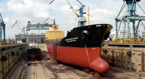 Сухой док (360 x 60 x 13,2 м) обслуживается двумя козловыми кранами грузоподъемностью 320 т каждый